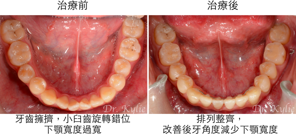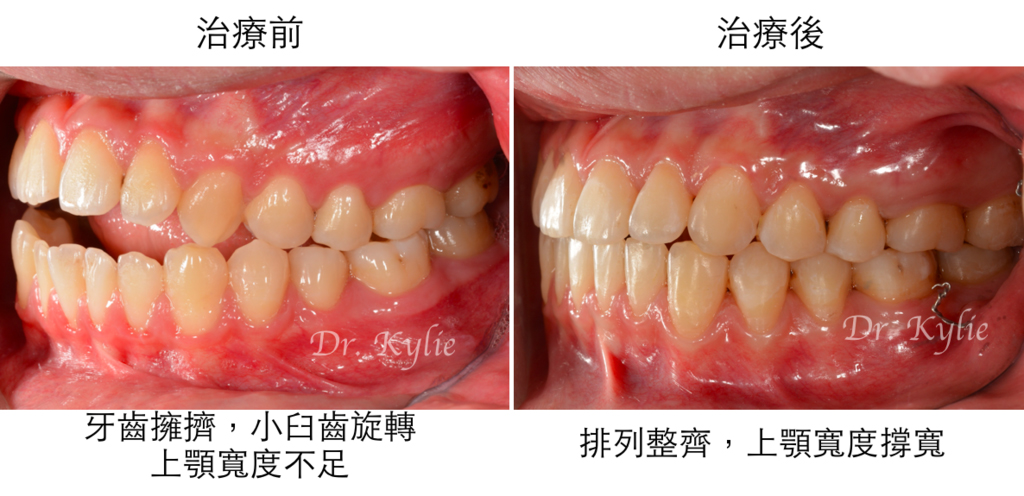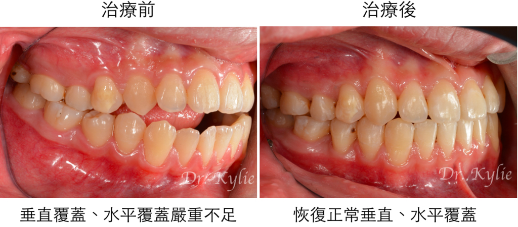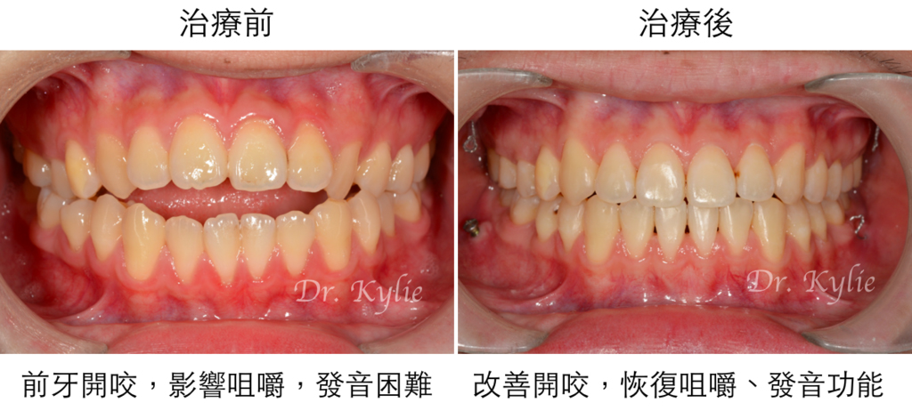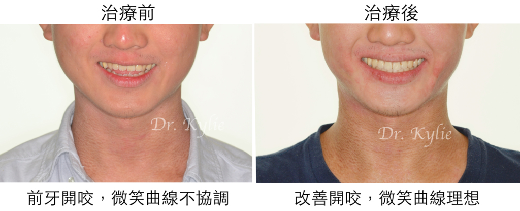 患者經過矯正治療後,已改善較嚴重的開咬問題,也恢復患者發音和咀嚼功能,整體美觀提升、完美微笑曲線。