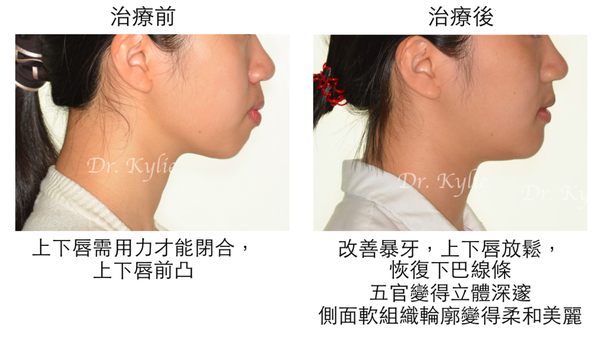 患者主訴為暴牙合併笑齦、嘴唇無法閉合,臨床分析患者屬於骨性暴牙,上下唇前凸,嘴唇無法輕鬆閉合。