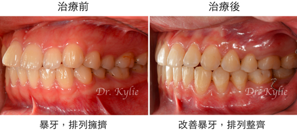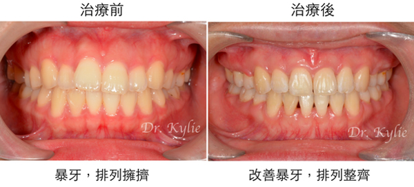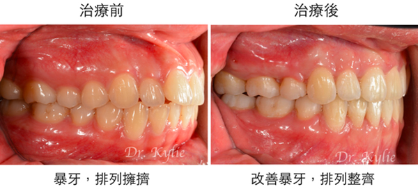 患者矯正治療後,大幅改善骨性暴牙和齒列擁擠問題,嘴唇可以輕鬆閉合、四周肌肉線條柔美,呈現美麗微笑曲線。