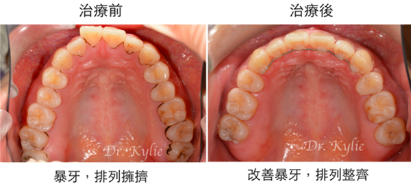 由於患者上顎前牙及後牙牙冠高度都過長,合併高下顎平面角,導致嘴唇無法輕鬆閉合,放鬆時上顎牙齒露出過多。患者的治療計畫是將四顆小臼齒拔除,上顎兩側矯正用迷你骨釘,幫助上壓後牙、前牙往後拉,改善骨性暴牙問題。
