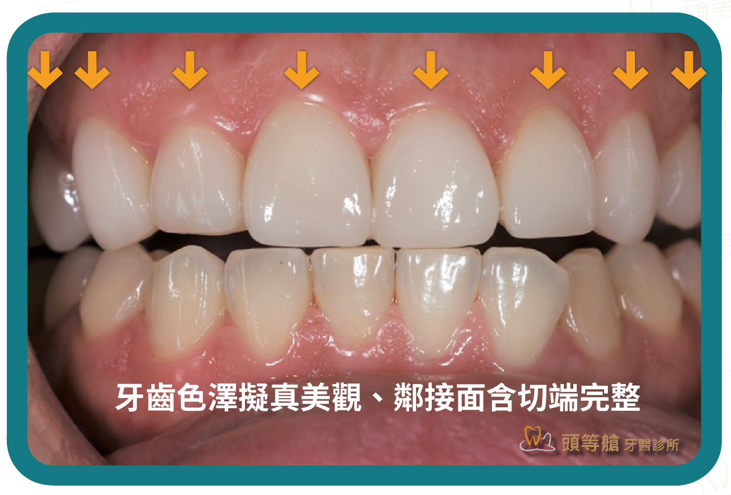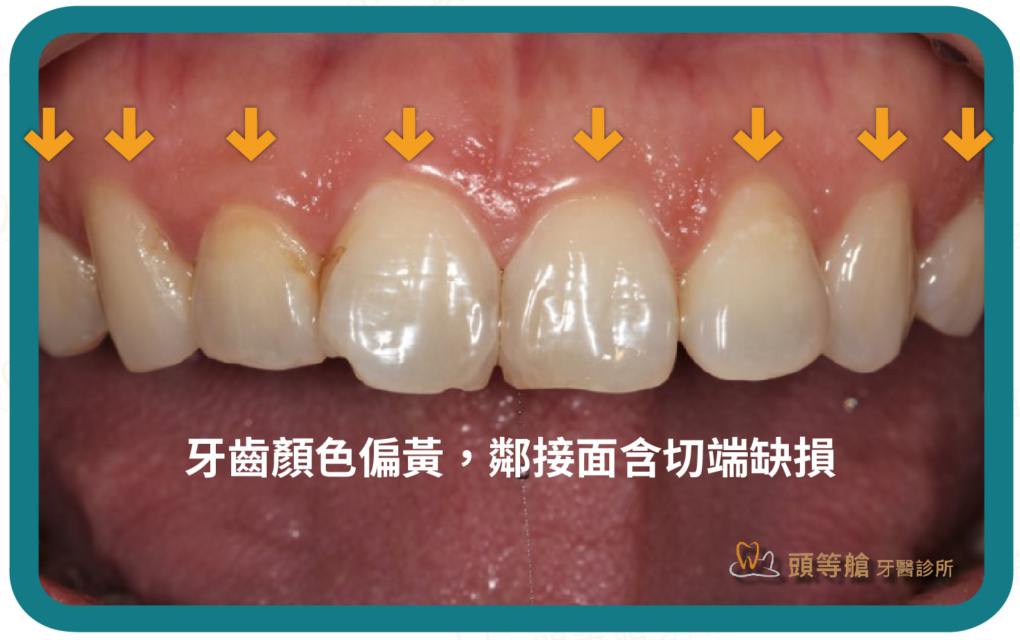患者因牙齒鄰接面含切端處有缺損、且牙齒顏色泛黃,有輕微脫鈣及色素沉澱現象,通常是飲食習慣與牙菌斑等因素導致,