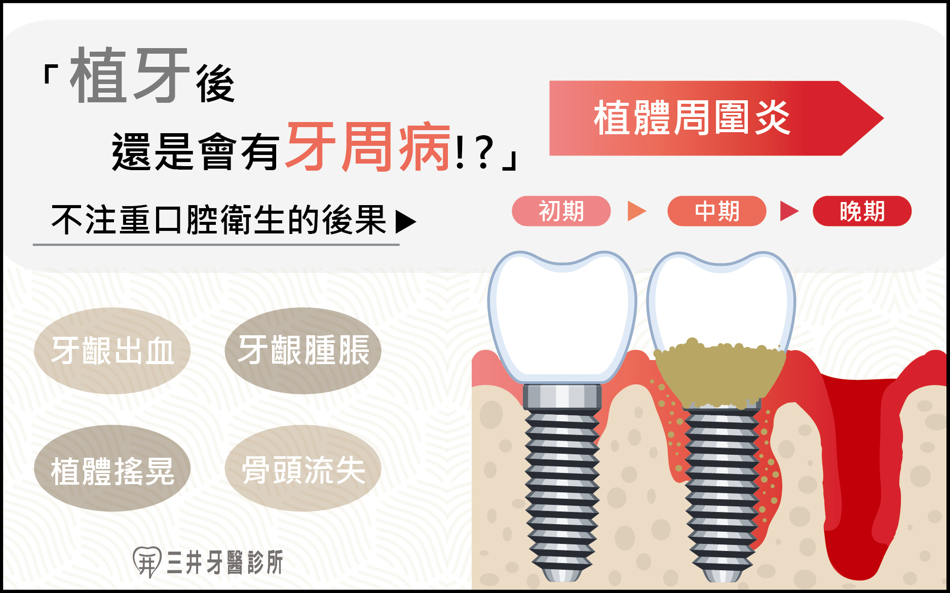 某些特殊疾病患者,如糖尿病者若病情控制不佳則會降低人體免疫功能,加重細菌破壞牙周組織,都可能讓植體周圍組織變脆弱,易受細菌侵入而導致發炎破壞。