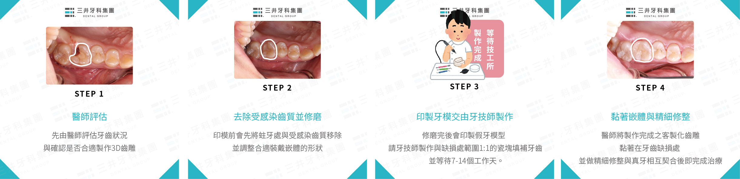 印模前會先將蛀牙處與受感染齒質移除,並調整合適裝戴嵌體的形狀。